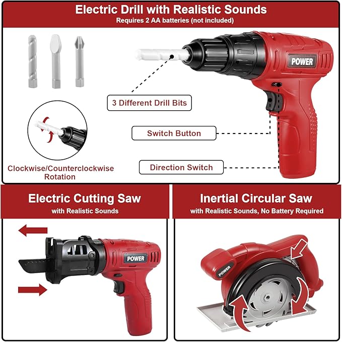 - 【3 in 1 Electric Toy Drill & Cutting Saw】This 3 in 1 kids drill in Vextronic toddler tool set comes with three different drill bits, and you can change the direction of the drill toy by pressing the direction button. By simply removing the drill bits and attaching the saw head, it instantly becomes an electric cutting saw. Both the toy drill and cutting saw can simulate real movements and produce realistic sound effects. (Tips: Requires 2 AA batteries, not included)