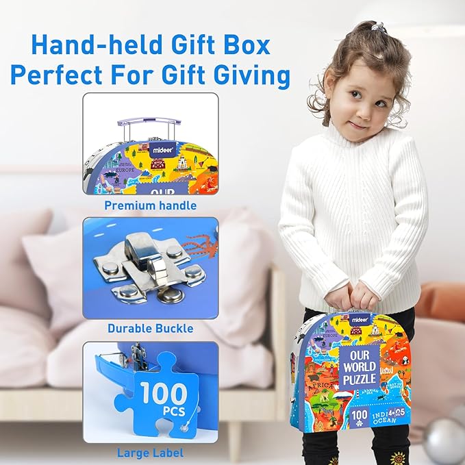 - 【Travel Around The World At Home】Mideer 100 piece puzzles for kids ages 4-8, including 100 puzzle pieces, 1 puzzle guide and 1 handheld gift box for storage, depicts geographical features of 43 countries, 49 landmarks and natural scenery, 41 animals and plants, 39 historic features and customs... Kids travel around the world even at home! Learn about scenic spots and landmarks, local customs and traditions, famous plants and animals. It's a great geography learning toys for kids.