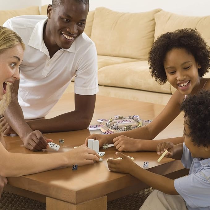 • Includes metal storage case, dominoes, wooden train hub, metal train markers, score pad, and rules.