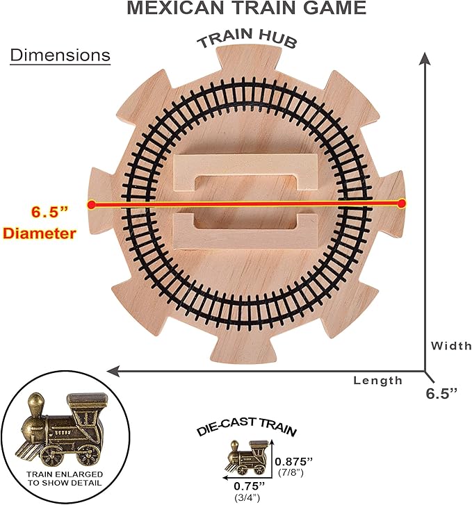 • Quality Mexican Train dominoes set with wooden train hub and 8 die-cast metal Mexican Train markers.