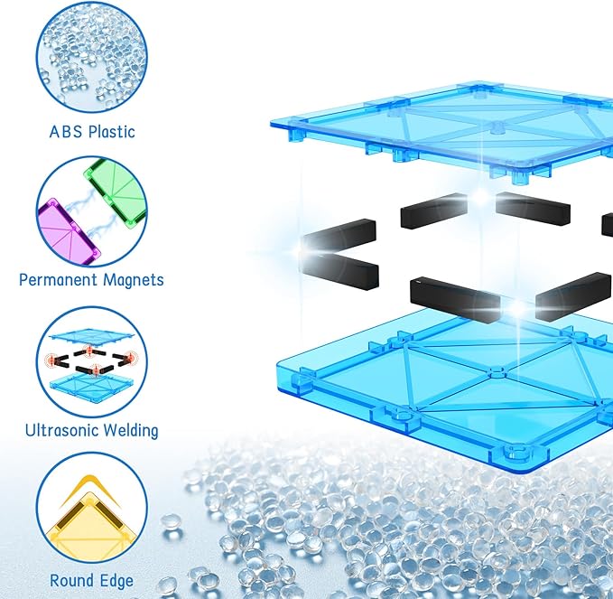 - SAFE POWERFUL MAGNET - The magnetic blocks are crafted from premium quality, non-toxic ABS materials, and every corner are forged with round edges for safety and smooth hand-feeling. Adopting ultrasonic welding process and over 1000 anti-throw tests can ensure that they won't fall apart easily and prevent it from breaking apart. Safe and strong kids toys, are made to last and keep your little ones safe.