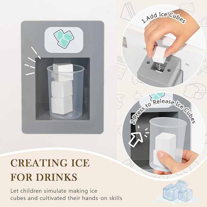• Real function: built-in ice dispenser are safe material for children, and the wooden cubes can be released to the bottom floor, and kid can Shovel ice cubes from the refrigerator. It's really a realistic role play!