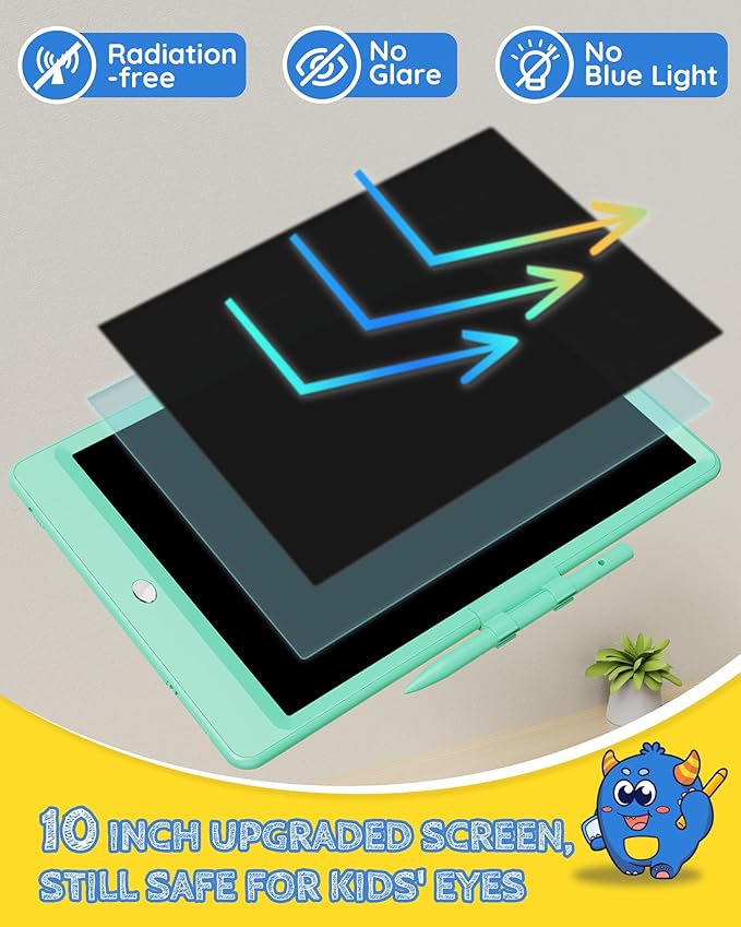- Free Child’s Imagination: The LCD writing tablet for kids provides 10 inches of space for kid’s writing and drawing, free children's imagination. The eye-protection colorful screen of doodle board provides a better painting experience, avoiding injury to a child’s eyes from long-term use