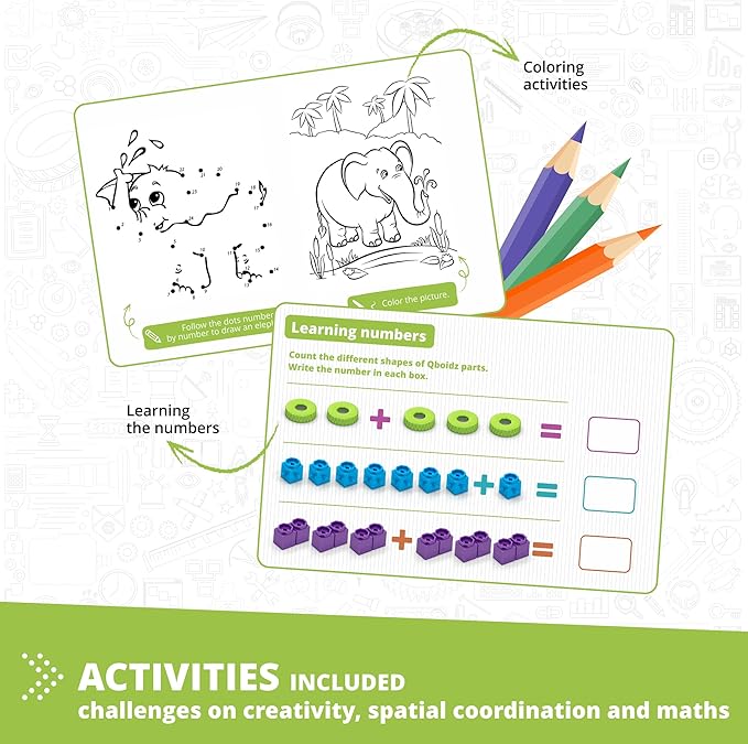 • ADDITIONAL ACTIVITIES INCLUDED: Challenges on creativity, spatial coordination and math. Includes coloring and learning numbers activities. LEARNING FACTS included for each model to be created.