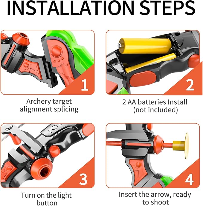 • Night LED Light Cool Toys - This archery set with LED lights is suitable for indoor activities and outdoor games. After inserting 2 AA batteries (not included), press the button to turn on the LED light, allowing you to easily track the arrow at night and enjoy a wonderful shooting game.