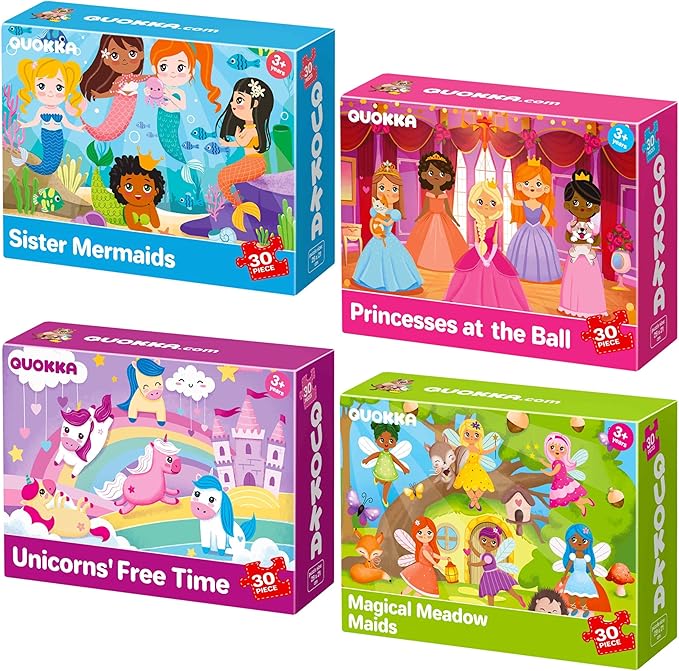 • 4-PACK KIDS PUZZLES: with set by QUOKKA you get 4 jigsaw puzzles 11,4 x 8,3 inch for kids ages 3-5; Our girls toys ages 6-8 are made of safe high-quality cardboard; Each 30 pcs giant floor puzzle comes with storage box that shows completed artwork