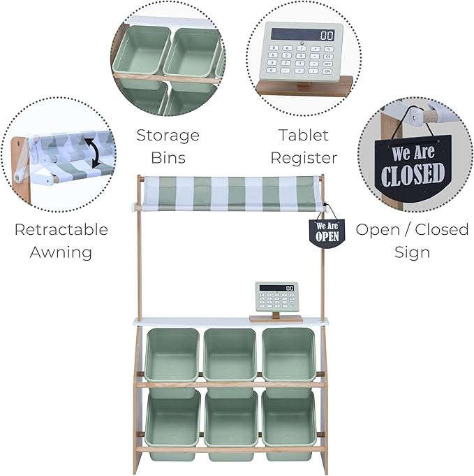 • INTERACTIVE DESIGN: "We Are OPEN/CLOSED" sign, foldable awning, and wooden cash register tablet provide a complete market experience to encourage role play and light up your little one's imagination and creativity