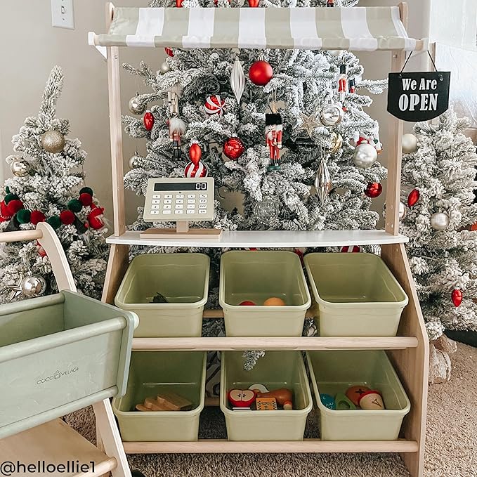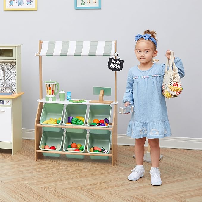 • STORAGE: Includes 6 green plastic storage bins that can be used for pretend fruits and vegetables as well as other play kitchen accessories, toys, games, and more