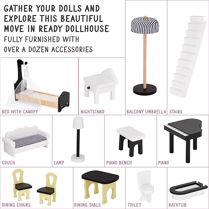 - DOLLHOUSE FURNITURE SET INCLUDED | Highly Realistic, Meticulously Decorated & Fully Immersive, Our Imaginative Play Set Has Little Ones Playing Straight Out the Box with 12 Lifelike Accessories: Living Room Sofa, Lamp, Kitchen Table, Chairs, Bathtub, Toilet, Piano, Bench, Patio Umbrella, Canopy Bed & Bedroom Nightstand | Rooms are Also Covered in Colorful, Detailed Wallpaper for Gorgeous Aesthetic