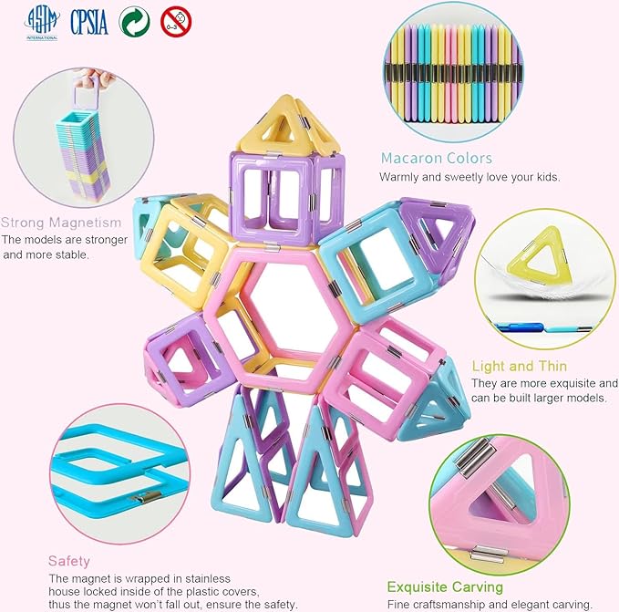 - 【Ideal Gift for Girls】Surprise the little ones in your life with this fun and educational magnetic tile set. Whether for birthdays, holidays, or any special occasion, this magnet tiles set is a perfect gift for kids aged 3+. Can be displayed at a party, craft project, camp, family fun day, creativity activity in the classroom, car, train, plane and outdoors for a fun day. Foster learning and fun with this engaging building toy!
