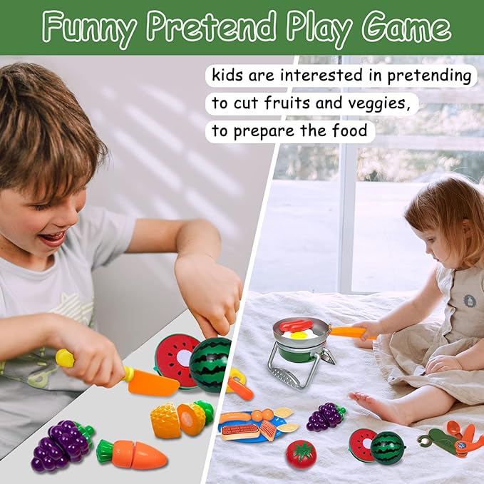 - ใโฅ Pretend Play GameใIt contains more than 30 pieces toy, include play tent, campfire, pan, cut up fruits, toy food, lantern and so on. Suitable for kids pretend play games and dramatic play class in preschool. They can cut up the fruits , bake the S'Mores, boil the water, fry the egg.... Really funny !