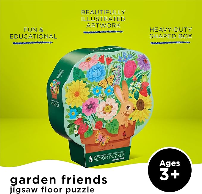 Crocodile Creek 36-Piece Jigsaw Floor Puzzle - Fun Floor Puzzles for Kids Ages 3-5 - Heavy-Duty Shaped Box for Storage - Garden Friends - 27" W x 20" H Finished