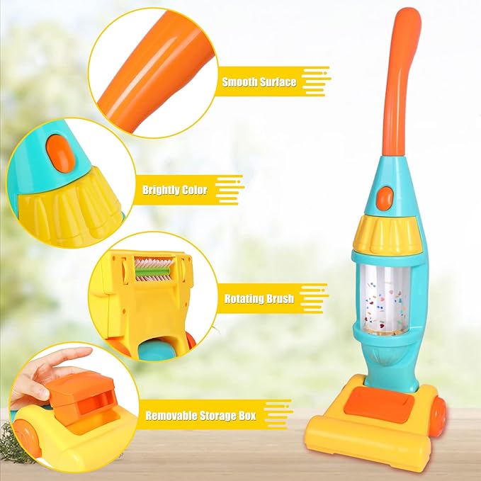 - Realistic Kids Vacuum Toy: When this toy vacuum cleaner is turned on, the lights will turn on, the star sequins will rotate and the simulated sound will sound, the detachable cleaning box and the bottom rotating brush add realism, just like the real vacuum cleaner starts working, cute, fun and lifelike.