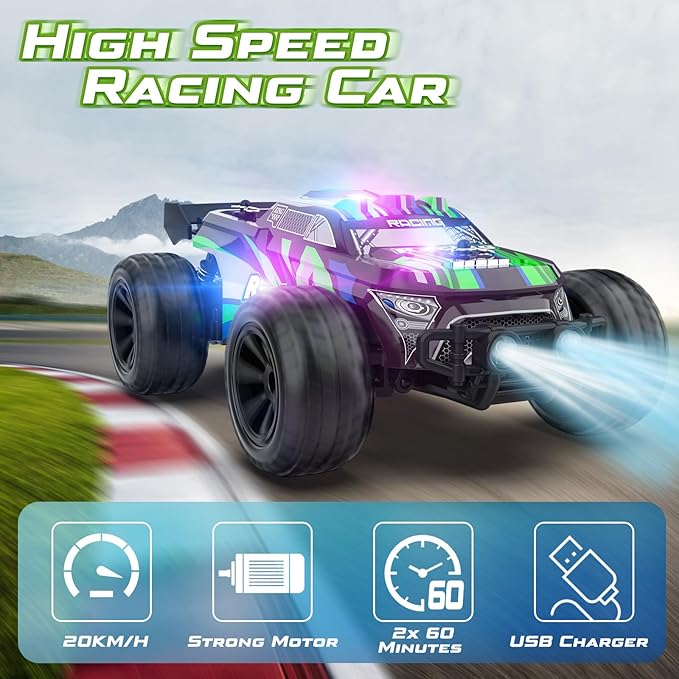 Remote Control Car - 20km/h 2.4GHz High Speed RC Cars, Off Road Hobby RC Racing Car with 2 Rechargeable Batteries & LedLights, Toy Car Gift for 3 4 5 6 7 8 Year Old Boys Girls Kids
