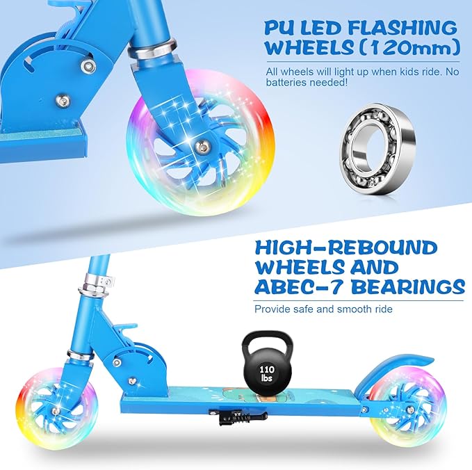 - [Led Light Up Wheels] The LED light up scooter, Motion sensor installed(NO need battery). Lightning wheels do glow with many colors when it spins which will make it more fun at night and keep kids be safe.