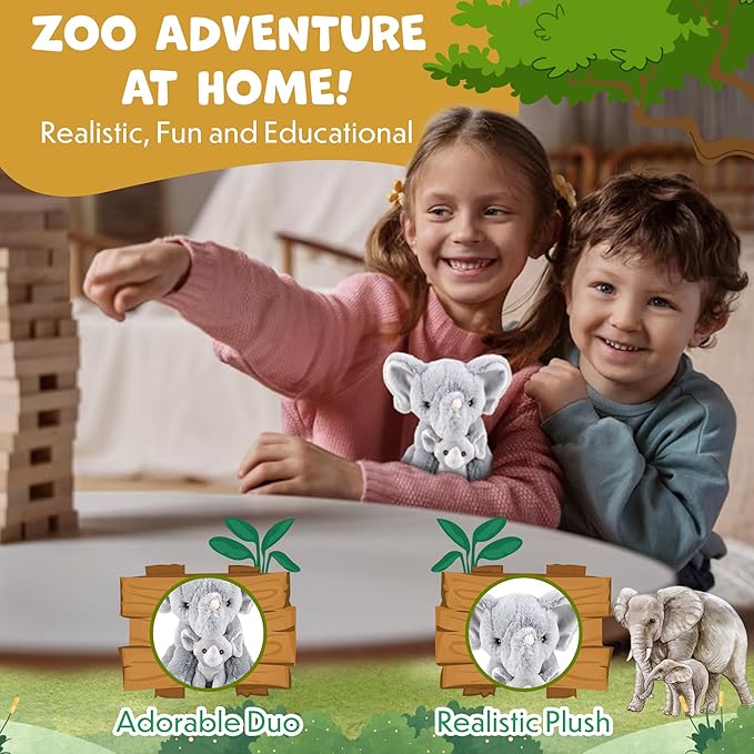 Mom and Baby Stuffed Animals for Boys & Girls, Safari Baby Shower Decorations, Nursery Decor, Zoo Animals for Toddlers, Quality Realistic Toy for Kids, Cute, Soft, Huggable, Squeezable (9.5" Elephant)