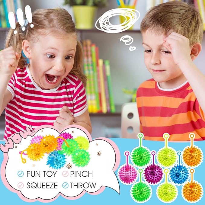 - Surprising Design: each LED ball has a rope, which can be put on the finger for playing and carrying; Pressing the ball with your hand, it will make a squeaking sound, and you can shake the ball to make it emit a colorful light, the light will automatically stop after dozens of seconds