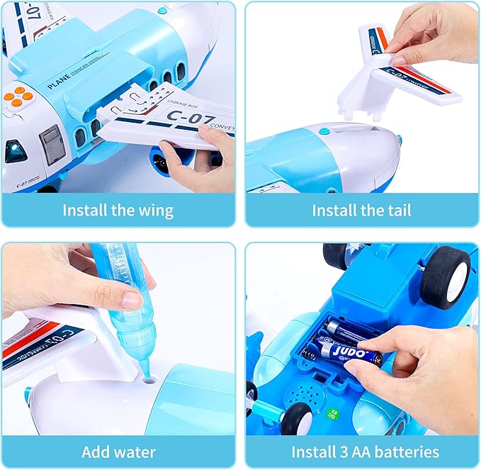 • [Unique Features - Smoke Design] Compare with other planes, our airplane toy is larger (size:15.7''x14.9''x7.8''), and increased simulated steam spray design. Just open the lid of the airplane, add to water, push it forward, and the tail of the airplane can produce a realistic spray effect.