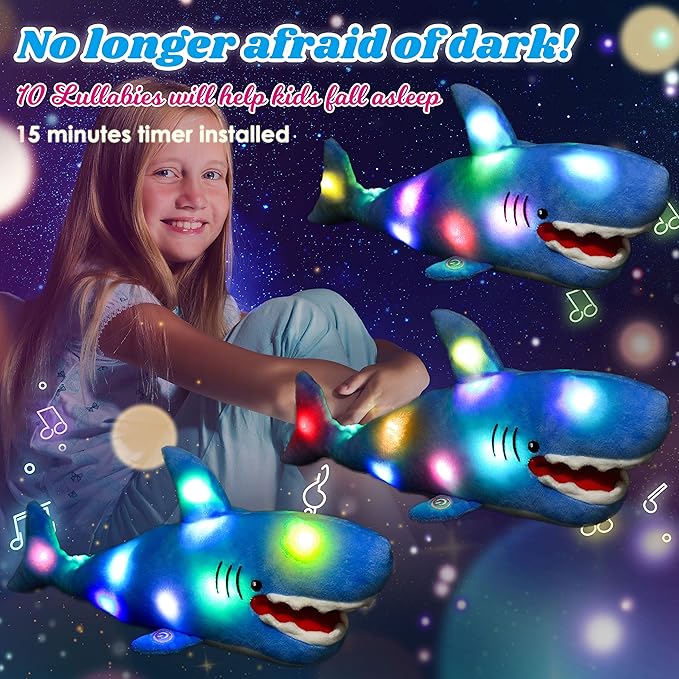 - GLOWING AND MUSICAL FUNCTION: This plush shark has the ability to glow in the dark and sing lullabies. In addition, we've installed a 15-minute timer inside so that if you don't touch the switch within 15 minutes, it will automatically turn off. However, you can still turn it off by pressing the switch again. You can find more detailed instructions on our product leaflet.