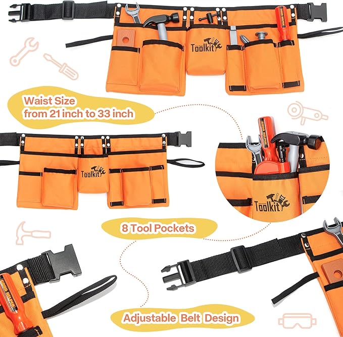 - High-Quality Big Range Adjustable Kids Tool Belt For Easy Storage: Made of high quality Oxford Fabric, our kids tool belt with 8 pockets create plenty of space for tools, adjustable belt is suitable for waist 21 inch to 33 inch. The whole set tools could be placed into this toddler tool belt for easy storage
