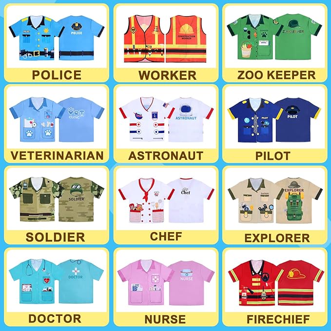 - Career Theme Design: the kids role play costumes are designed for 12 common occupations, including police, fireman, construction worker, astronaut, doctor, explorer, chef, pilot, soldier, vet, nurse, animal keeper; These career costumes are fun and realistic enough to immerse you in role playing