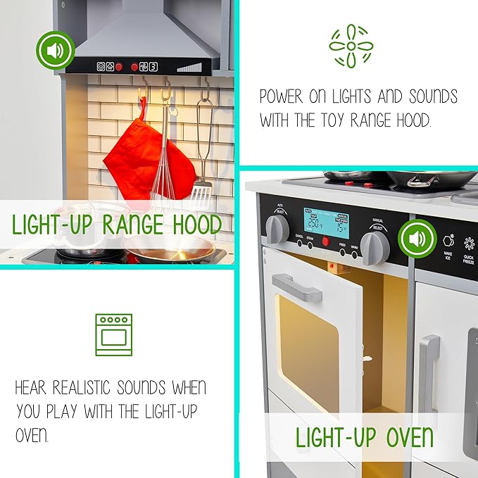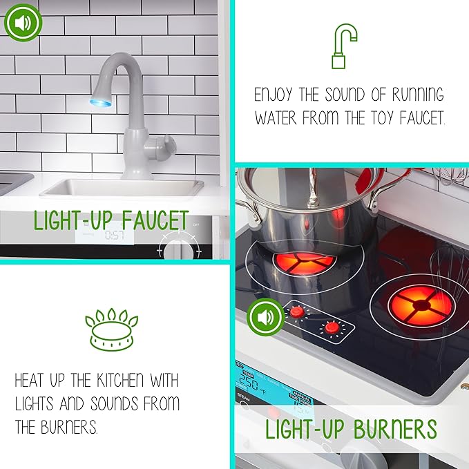 - SUPER REALISTIC SIGHTS & SOUNDS | Much More Than a Toy, Our Interactive Design Enables Meaningful STEM Kinesthetic Learning as Boys & Girls Immerse Themselves in a Real Kitchen Setup | Elements Include Battery-Operated Microwave, Oven, & Range w/ Light & Sound, Clicking Knobs, Ice Dispenser That Throughs Out Ice Cubes & Much More