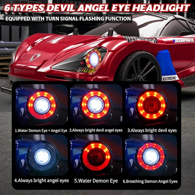 - 6 COOL LIGHT MODES & REAL TAILLIGHT EXPERIENCE: The front of the car is equipped with 6 adjustable lighting modes, simulating the lighting effects of real racing cars, making your car the focus whether it is day or night. The taillights light up synchronously when starting braking, etc., increasing driving fun. Add an irresistible highlight to family entertainment, outdoor racing or gift selection!