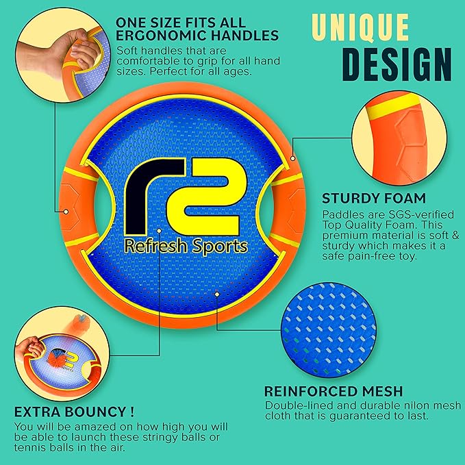 - π π¨ππ§ππ£ππ πππ ππ¦, π’π‘π π¦ππ§: Easy to pick up and play Badminton, Tennis, Baseball, and so much more! With the stringy balls and paddle's bouncy mesh, you can easily transition between games that would normally require separate equipment. You can even swap the rubber balls for water balloons on hot summer days for some extra splashy fun!