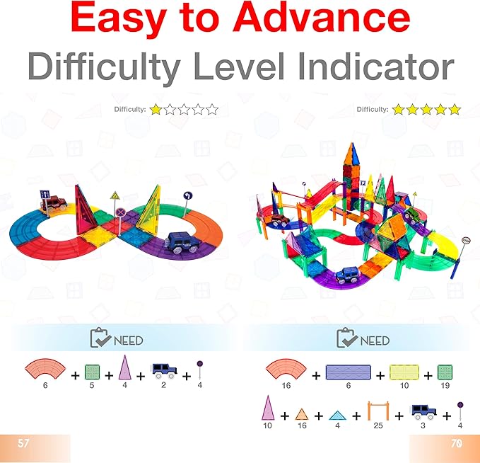 - DREAM BIG & BUILD BIG - Turn your dream ideas into reality and build based on the color vibrant illustrations shown on every page of this idea book with difficulty scale. Create and inspire from over 150 different ideas to nurture children imagination to build their own unique masterpiece. Find ideas for every kind of magnetic tile building block set and challenge yourself to create new designs by combining construction blocks and magnet tiles. Unlock your imagination young or young at heart