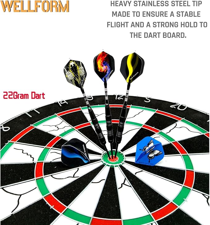 - [PERFECT CONTROL, ACCURACY, CONSISTENCY] WELLFORM darts metal tip set are professionally designed. These darts are 22gram which are the most ideal weight which providing excellent balance and precise throws. The accurate design provides a nice hand-feeling and excellent control of the darts. These figures improve the throwing accuracy, thus it is more easy for you to get a high score. When you use this darts steel tip set, you will notice a significant improvement of your skills.