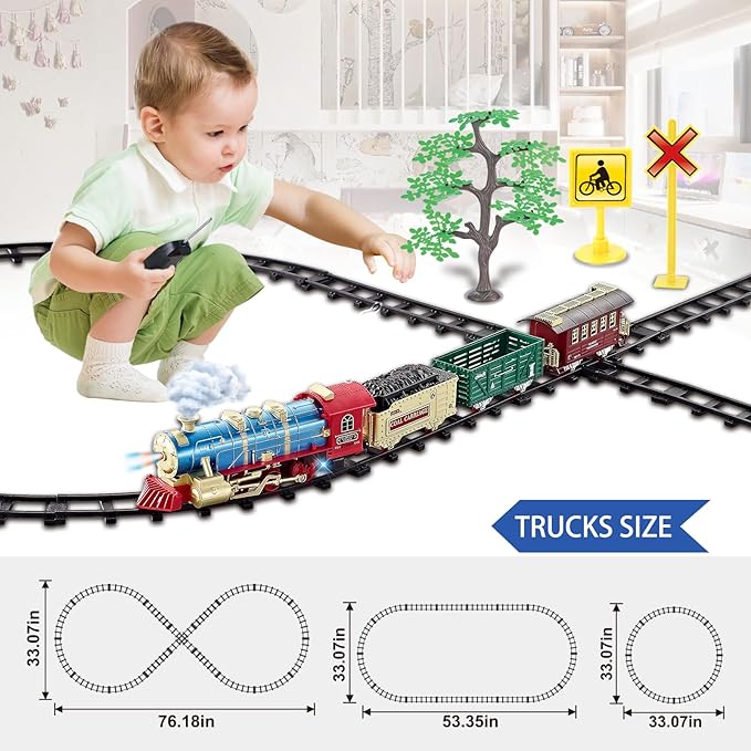 - 【COOL REMOTE CONTROL TRAIN SET】Kids can use the remote control of the electric train to stop, go forward, accelerate or reverse, and control the whistle ON/OFF. Remote train can improve little angel hands-on ability and thinking ability. At the same time avoid the danger of injuring kids hands. Enjoy the fascinating steam electric train set together!