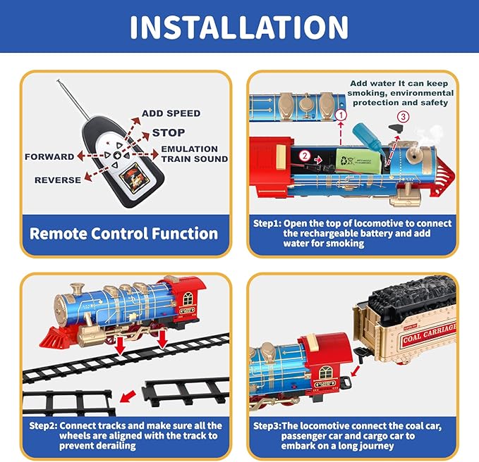- 【SAFE & REAL EXPERINCE】 Our toy trains are made of non-toxic, high-quality ABS material to USA safety requirements of ASTM, F963, CPC and CPSIA. Kids can add water into the water inlet with the water bottle, then real steam will be produced from the chimney. This is not like others produce an odorous smell with oil. The nice train sets for boys 4-7 8-14. The electric train also can simulate real train sounds and headlights to make sure your family deserves a fun and safe experience.