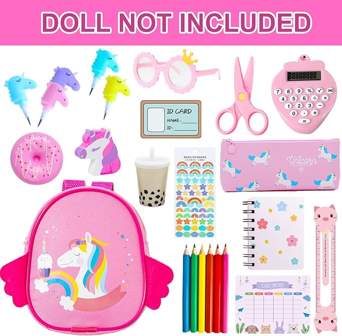 - Doll School Set: Suitable for 18 inch Dolls, 25 pcs doll school supplies playset, including 1 doll clothes, 1 school bag, 1 glasses, 1 notebook, 1 ruler, 1 class schedule, 1 student card, 1 eraser, 1 scissors, 1 calculator, 1 pencil case, 1 milk tea, 1 donut, 1 sticker, 5 pens, 6 pencils (Excluding dolls and shoes).