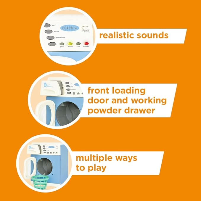 • REALISTIC ROLE PLAY: Open the front loader door, pop in some washing, fill the powder drawer, and choose the wash and spin settings. This toy set will provide hours of fun with realistic play including flashing lights and sound effects when a load is done