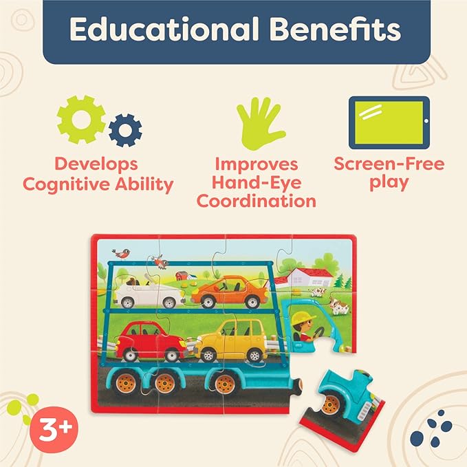 • Includes: This set comes with 4 wooden puzzles that feature colorful trucks – a car carrier, a front-end loader, an excavator, or a dump truck.