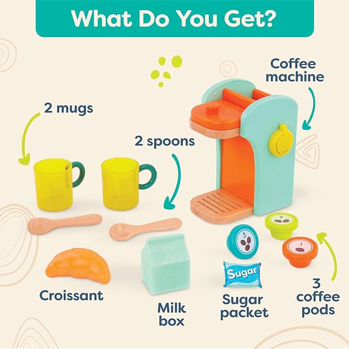 B. toys- Café au Play- Pretend Play Wooden Coffee Maker for Kids- Wooden Coffee Machine Set – 10 Pretend Play Accessories – Kitchen Play Set – 2 Years +