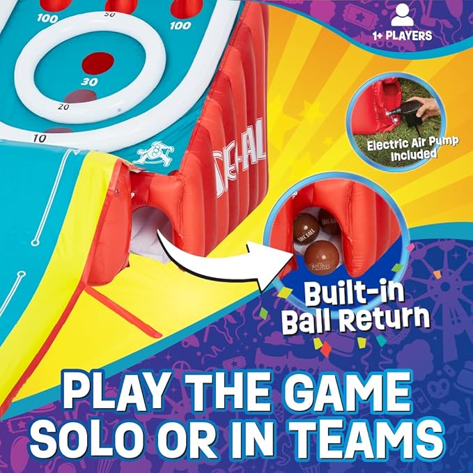 • GIANT: Get ready for some big fun with this inflatable Skee-Ball Game. This outdoor game is perfect for the whole family and includes 4 rubber balls and an electric air pump for easy setup