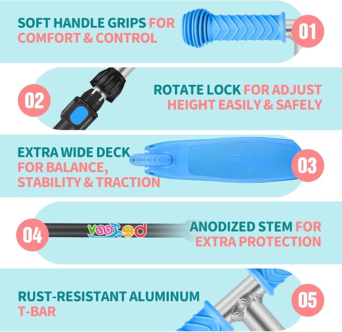 - Turn and Stop with Ease: The 3 wheel scooter utilizes a Lean-to-Steer system, kids use their body weight to safely steer, making steering a breeze. It helps children build up their coordination, balance, and motor skills as they ride. A foot brake with built-in stainless steel on the back wheel that even young kids can use with ease, effectively slow down and stop the scooter safely, avoid falls and accidents.