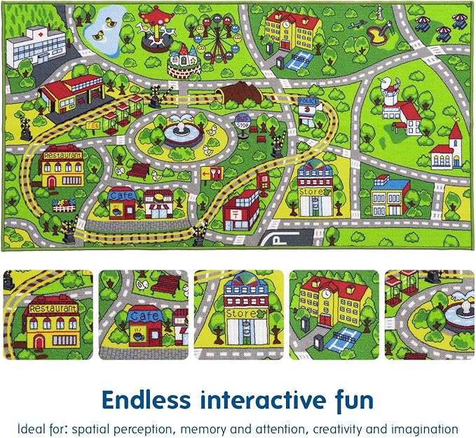 - Play Is The Best Way Of Learning: Motivate your child's curiosity and interest! The educational car roads train rug play mat with a vibrant and imaginative city town scene design,featuring elements like a train, race track, store, bus stop, cafe,restaurant,and tele etc.,and provides a fun interactive backdrop for children to host many exciting games. This city town setup allows your little one to enjoy playing with various vehicles such as cars,trucks,and trains