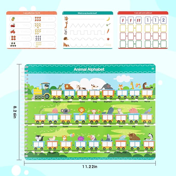 - Multi-Functional Learning Activities: From ABC to Creative Play. This handwriting practice book offers 37 interactive pages with a variety of activities, including letter tracing (A-Z), number recognition (1-10), mazes, coloring, and DIY pages for creative expression. The smooth, reusable surface allows for endless practice, making it a long-lasting educational toy for young learners. Perfect for home, school, or travel!
