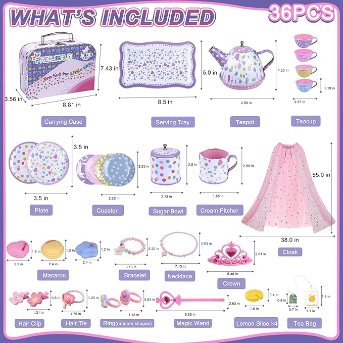 - 【36PCS Princess Pretend Tea Set】Includes 1 teapot ,1 servingTray, 4 teacups,4 coasters,2 plate,1 sugar bowl, 1 cream pitcher,3 macaron,4 lemon slices,1 tea bag,1 cloak,1 princess crown, 1 magic wands,1 necklace, 1 bracelet, 2 rings(random shapes), 2 hair clips, 1 elastic hair ties as well as a carrying case. Rich pretend tea toy accessories, create hours of fun playtime for your little pretty & elegant princess.