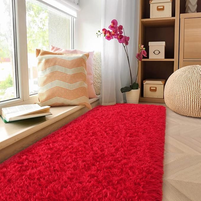 Amearea Shag Fluffy Runner Rug for Bedroom Girls Living Room, 2x6 Feet Extra Soft and Fuzzy Shaggy Rugs, Non Slip, Indoor Floor Long Carpet Mat for Boys Nursery Home Decor, Red