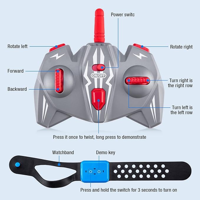 - 360° Rotation, LED Light Toy Glove RC Car: The gesture sensing twist racing car has all-direction tire can move in all directions: forward/backward, turn right/left, right/left drift, achieved 360°rotation & sideways drift with cool LED light & dance.