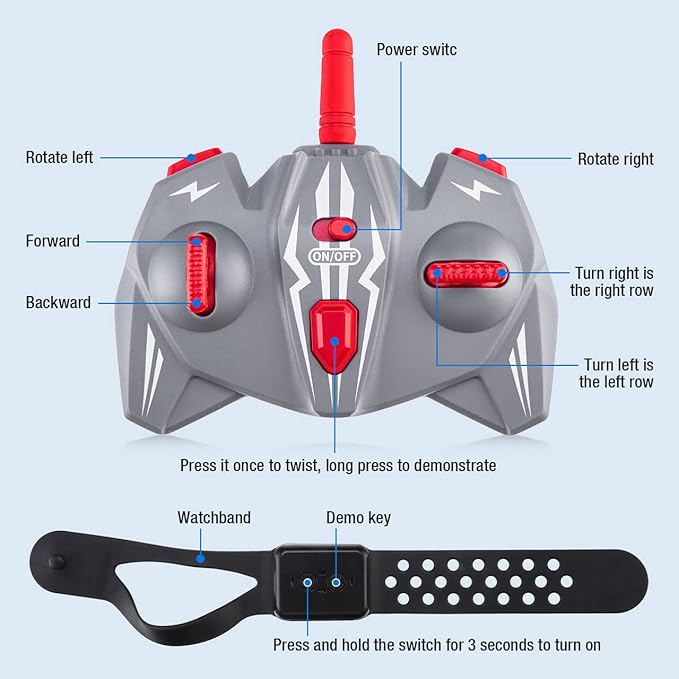 - 360° Rotation, LED Light Toy Glove RC Car: The gesture sensing twist racing car has all-direction tire can move in all directions: forward/backward, turn right/left, right/left drift, achieved 360°rotation & sideways drift with cool LED light & dance.