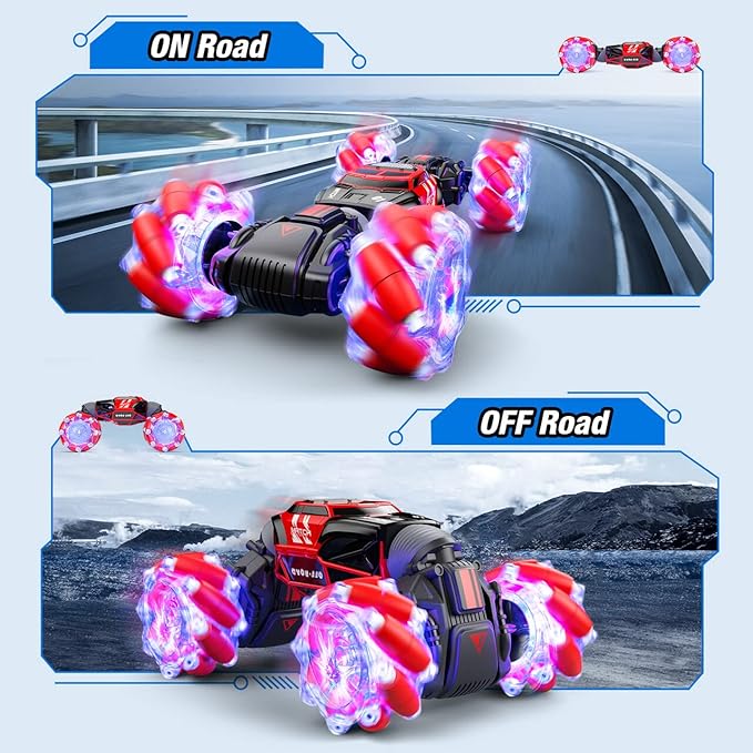 Powerextra Remote Control Car, 4WD 2.4GHz Gesture Sensing Rc Stunt Car, Double Sided 360°Rotating Off Road Car with LED Light & Music, Toy Cars for 6-12 Year Old Boys & Girls - Red