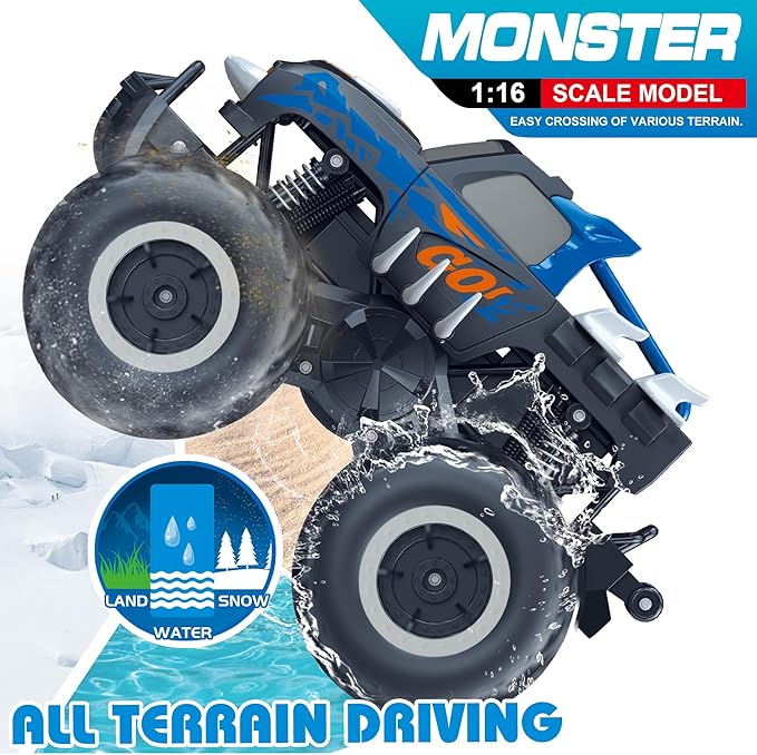 • WATERPROOF MONSTER TRUCK TOYS: Whether indoors or outdoors, the truck can easily conquer various terrains: like beach, swimming pool, land, stone road, beaches, and grasslands even in the water... will offer an exciting and versatile experience for kids. Nice presents for kids ages 6 to 12./// The Remote is not waterproof !!!