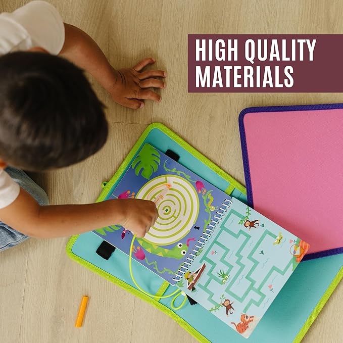 - KIDS TRAVEL ESSENTIALS: Mess free dry erase activity kit for kids to draw and doodle on the front. Tucked inside is an activity book with 18 simple, colorful erasable themed activities like tracing, mazes, drawing, search and find and more. Perfect travel toys for toddlers, kids car activities, plane travel, restaurants or any unexpected waits. Includes a full set of high-quality reusable stickers that attach to the pages of the activity book, sketch board, or airplane windows.