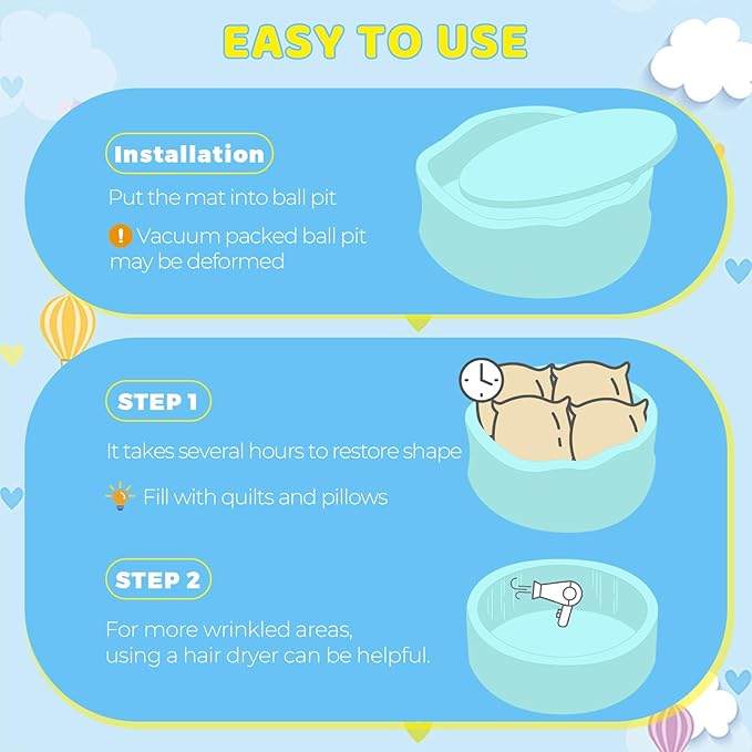 - 【Vacuum Seal Design】 The kiddie ball pit is vacuum-sealed. When you open the sponge, it will expand immediately, but it will not show a perfect circle immediately. It can be placed for 72 hours to wait for it to set. A hairdryer with moderate temperature or stuff the empty ball pit with pillows and blankets will help a lot to shape recovery.