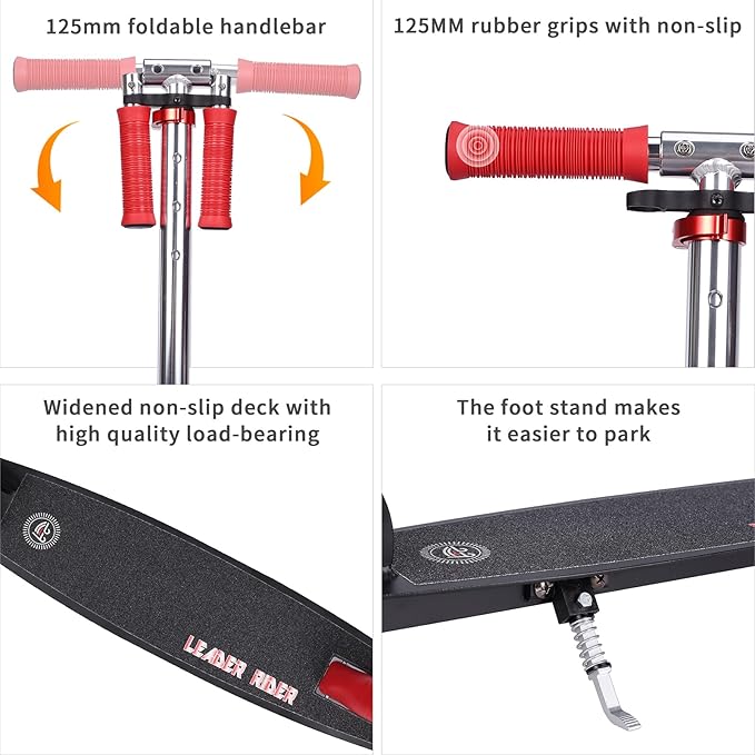 - STURDY AND DURABLE CONSTRUCTION: The LEADER RIDER Scooter is built to last with its sturdy and durable construction. It is equipped with ABEC-9 bearing PU wheels that can withstand regular use and provide reliable performance. The scooter's solid frame and robust design ensure stability and safety during rides, making it suitable for both kids and adults.