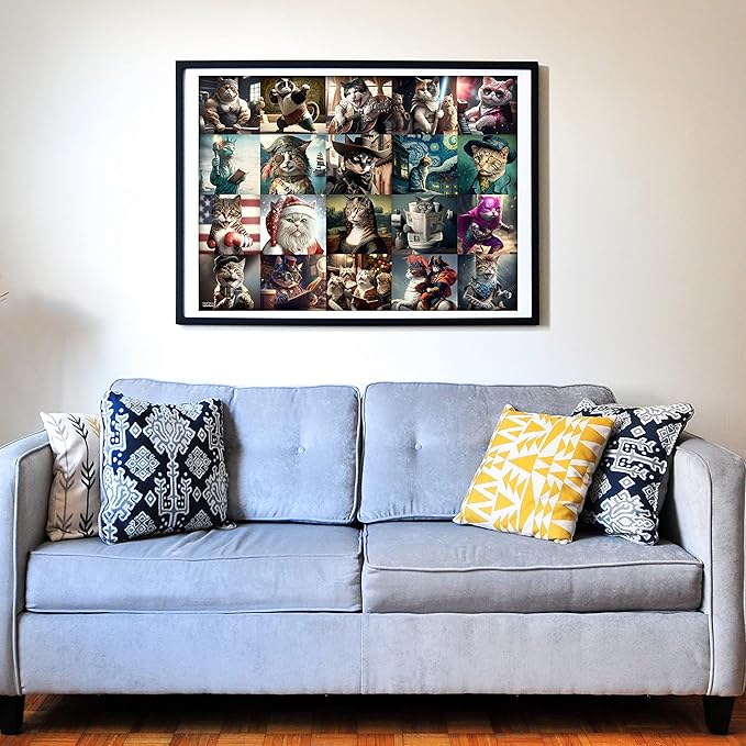 - 【Funny Cats】 - This puzzle is perfect for cat lovers and puzzle enthusiasts alike, with its vibrant colors, high-quality pieces, and 20 adorable cats including Shorthair, Ragdoll, Turkish Angora, American Curl, British Longhair, Bobtail and Ragamuffin. These furry friends are in adorable outfits including Superhero, Mona Lisa, Rock Star, Santa, Boxer, Zoro, Van Gogh, Statue of Liberty. They are also participating in incredible activities such as Boxing, Martial Arts and Pooping.